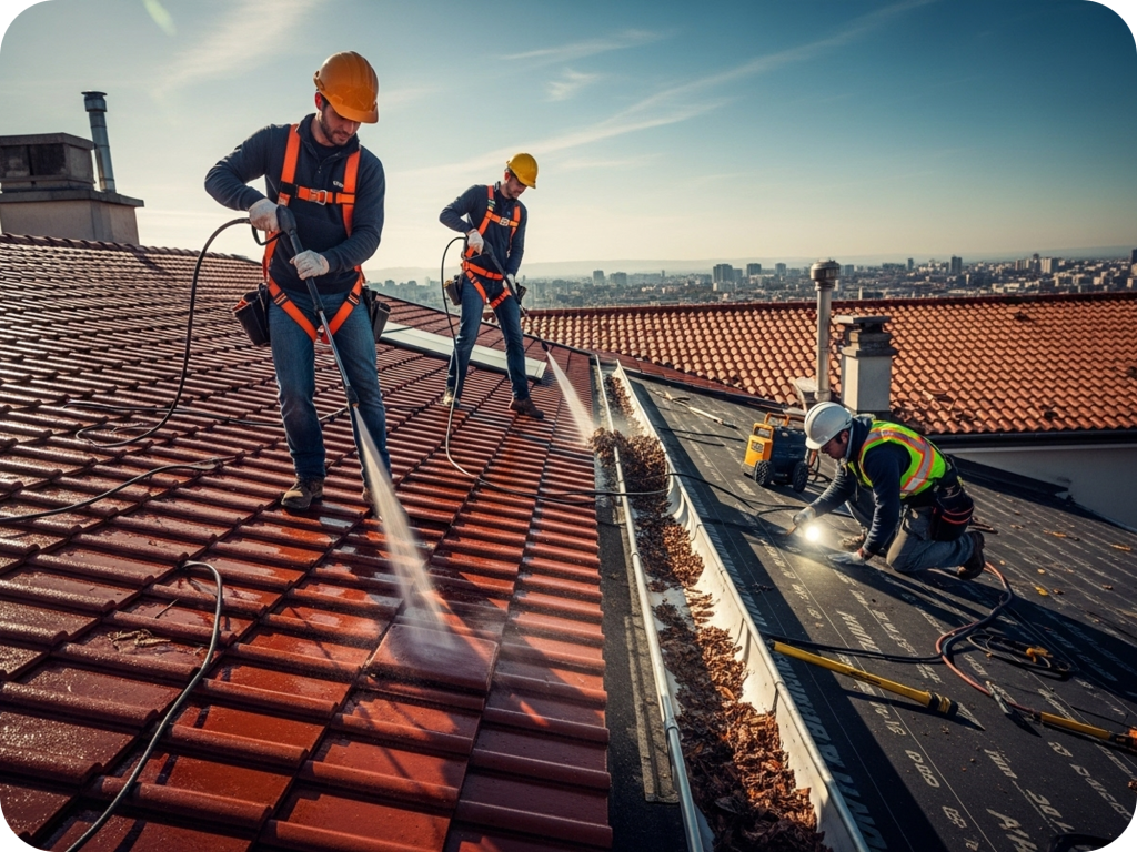 Pressure washing is one method to raise dirt and moss from the tiles, but it must be done carefully. High pressure sprays can crack terracotta roofing tiles, so it’s advisable to use a low pressure nozzle and spray at a slight angle. Soft-bristle brushes work well for gentle scrubbing, particularly around tile joints, ensuring that the roof remains in good condition and minimizing future roof repair costs.
